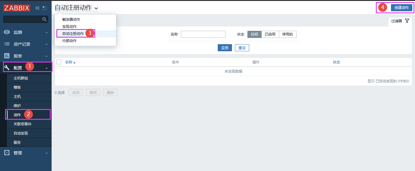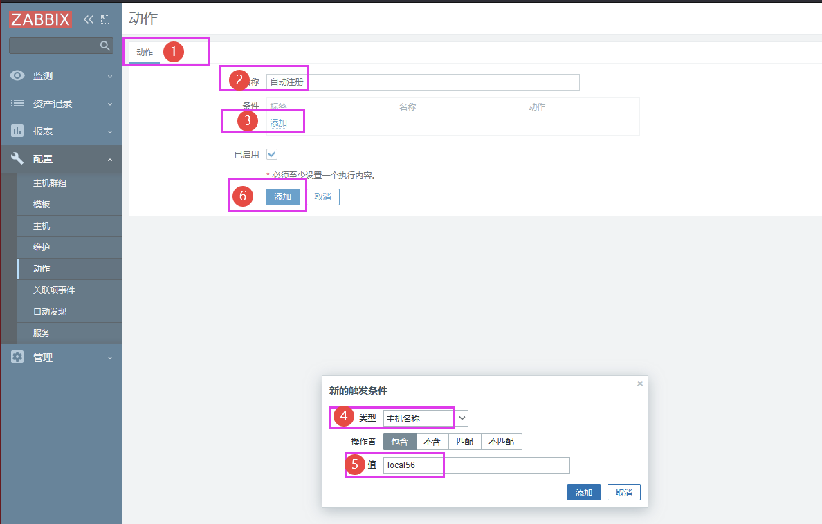 # 被监控端配置 修改被监控端agent2配置文件 ```asp vim /etc/zabbix/zabbix_agent2.conf ``` ```asp Server=127.0.0.1 #发送数据地址(修改为服务端IP) ServerActive=127.0.0.1 #主动链接地址(修改为服务端IP) Hostname=Zabbix server #主机名 (修改为自己的主机名) HostnameItem=system.hostname #开启自动注册 ``` 重启agent2服务 ```asp systemctl restart zabbix-agent2 ``` # 监控端配置 监控端验证通信是否正常 ```asp zabbix_get -s '192.168.1.56' -p 10050 -k 'agent.ping' ``` 添加主机解析 ```asp echo "192.168.1.56 local56" >> /etc/hosts ``` 配置-动作-创建动作  动作-名称-添加-填写主机名  操作-添加主机-添加主机群组-关联监控模板-添加